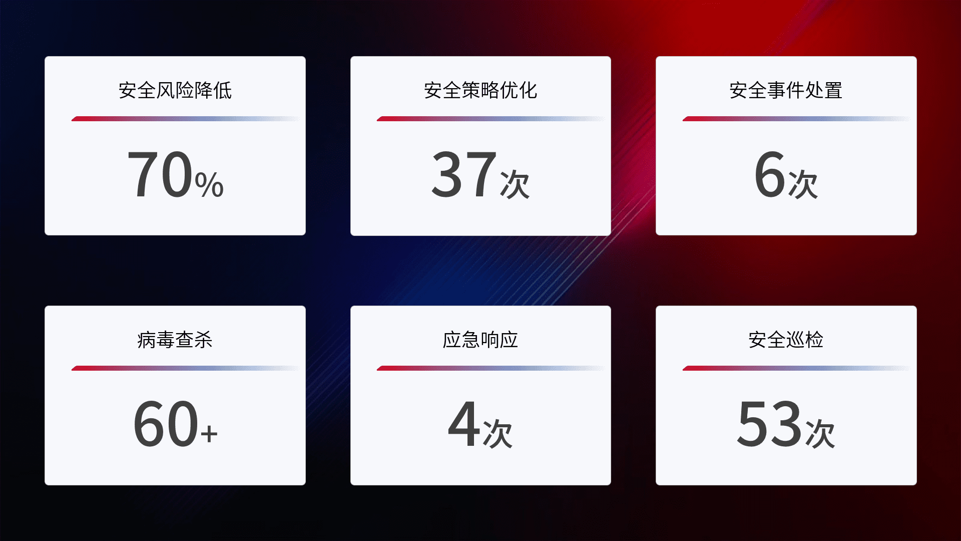 提供全面的安全事件报告体系,,包括处置报告、、、周报、、季度和年度总结,,,结合持续监控,,帮助客户深入了解网络安全状况。。。。